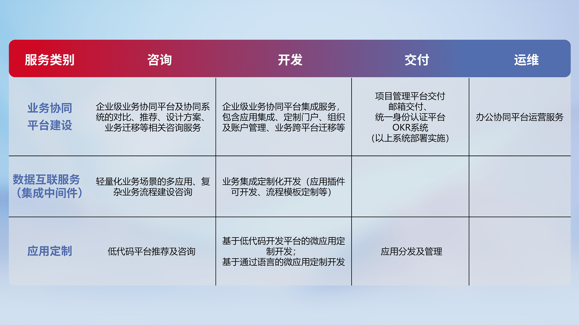 针对钉钉、、、企微、、、IDaas等平台级产品提供产品的规划、、、、方案、、交付、、、、定制化开发等服务,,,,实现如统一协同办公、、、、智能客户服务、、、混合会议管理、、、、智能数据查询、、、等业务场景,,,实现数字化转型。。。